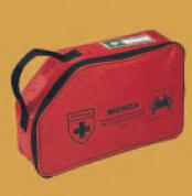 MONZA Verbandtasche 5 - eckige Verbandtasche aus Nylon mit Reißverschluss und Außenschutzfolie. Zusätzlich: Grifflasche und Selbstklebeetikett mit Verfalldatum und Aufbewahrungsort Inhalt nach DIN 13 164, 25 x 15 x 7 cm, rot