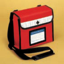 Sanitätsumhängetasche Umhängetasche aus Nylon mit verstellbarem Trageriemen und Schulterpolster sowie Reflektorstreifen auf der Vorderseite. 2 zusätzliche Riemen mit Karabinerhaken innen zur 90° - Stop - Arretierung. 23,5 x 19 x 8 cm, rot |